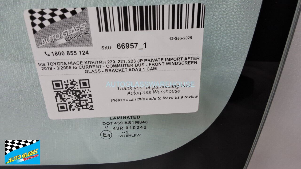 fits TOYOTA HIACE KDH/TRH 220, 221, 223 JP PRIVATE IMPORT AFTER 2019 - 3/2005 to CURRENT - COMMUTER BUS - FRONT WINDSCREEN GLASS - BRACKET,ADAS 1 CAM