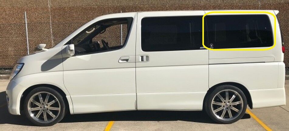 NISSAN ELGRANDE E51 - 1/2002 to 1/2011 - PEOPLE MOVER - PASSENGERS - LEFT SIDE REAR CARGO GLASS - WITH ANTENNA, 1 HOLE - DARK GREY
