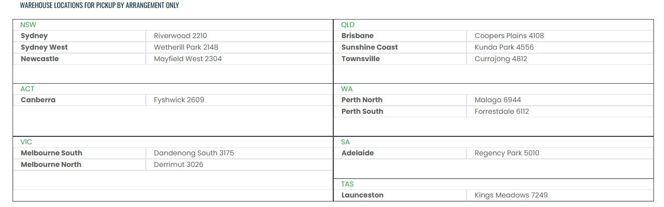 They are exclusively available for pickup at any of our multiple locations across Australia.