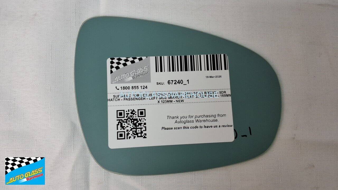 SUITABLE FOR LEXUS CT200H ZWA10R - 2015 TO CURRENT - 5DR HATCH - PASSENGER - LEFT SIDE MIRROR - FLAT GLASS ONLY - 169MM X 123MM