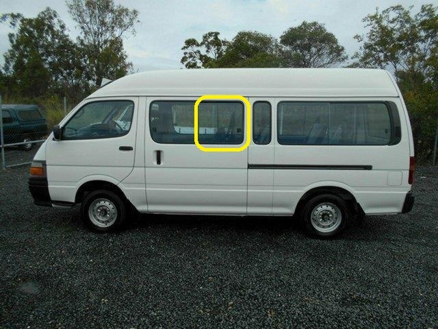 suitable for TOYOTA HIACE 100 SERIES - 11/1989 to 2/2005 - COMMUTER BUS MAXI - LEFT SIDE FRONT SLIDING DOOR GLASS - REAR 1/2 PIECE (LATCH HOLE) 565w